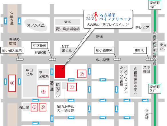名古屋高速都心環状線「東新町出口」からクリニック周辺駐車場までのご案内